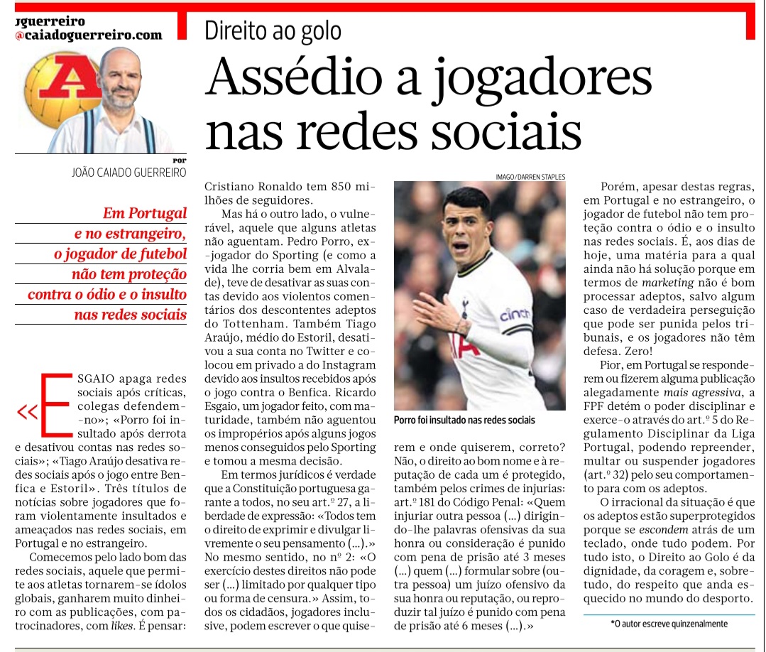 No artigo de opinião de João Caiado Guerreiro no jornal A Bola: "Em Portugal e no estrangeiro, o jogador de futebol não tem proteção contra o ódio e o insulto nas redes sociais".