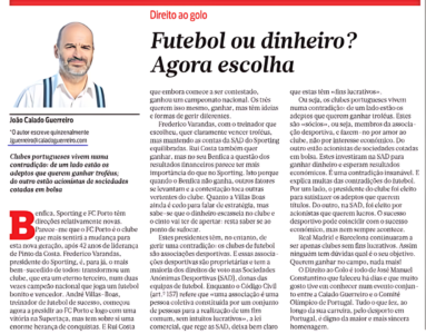 No "Direito ao Golo" de João Caiado Guerreiro no jornal A Bola: "Clubes portugueses vivem numa contradição: de um lado estão os adeptos que querem ganhar troféus; do outro estão acionistas de sociedades cotadas em bolsa".