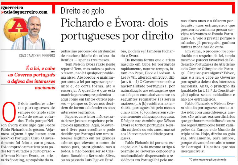 Artigo de João Caiado Guerreiro no Jornal A Bola.